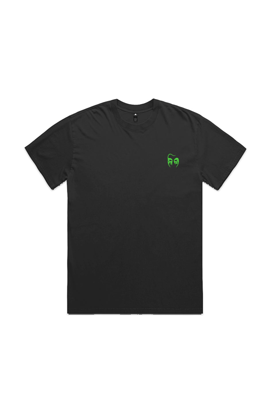 The Uncovered Logo Black Tee by PIERO uses contrast with precision. On the chest, the signature dual-mask logo appears in a striking neon green, sharp against the washed black base — bold but minimal, like a signal glowing in the dark.