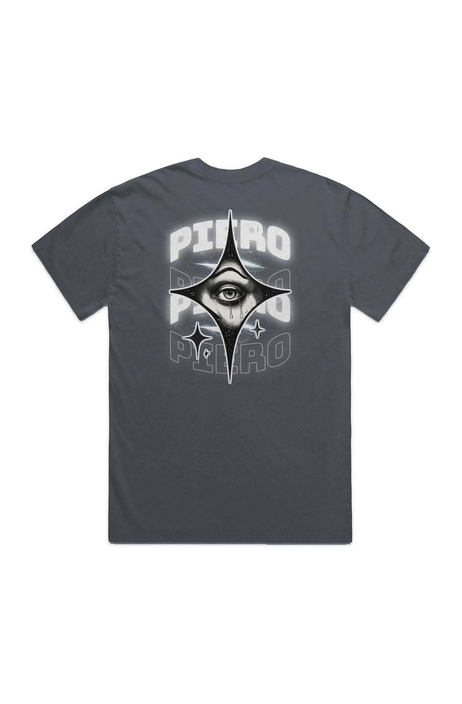 The Eye Drop Indigo Tee by PIERO channels introspection through a surreal visual centerpiece. The back features a sharp starburst cut revealing a hyper-detailed eye — teardrop included — surrounded by layered iterations of the PIERO name in multiple weights and depths.